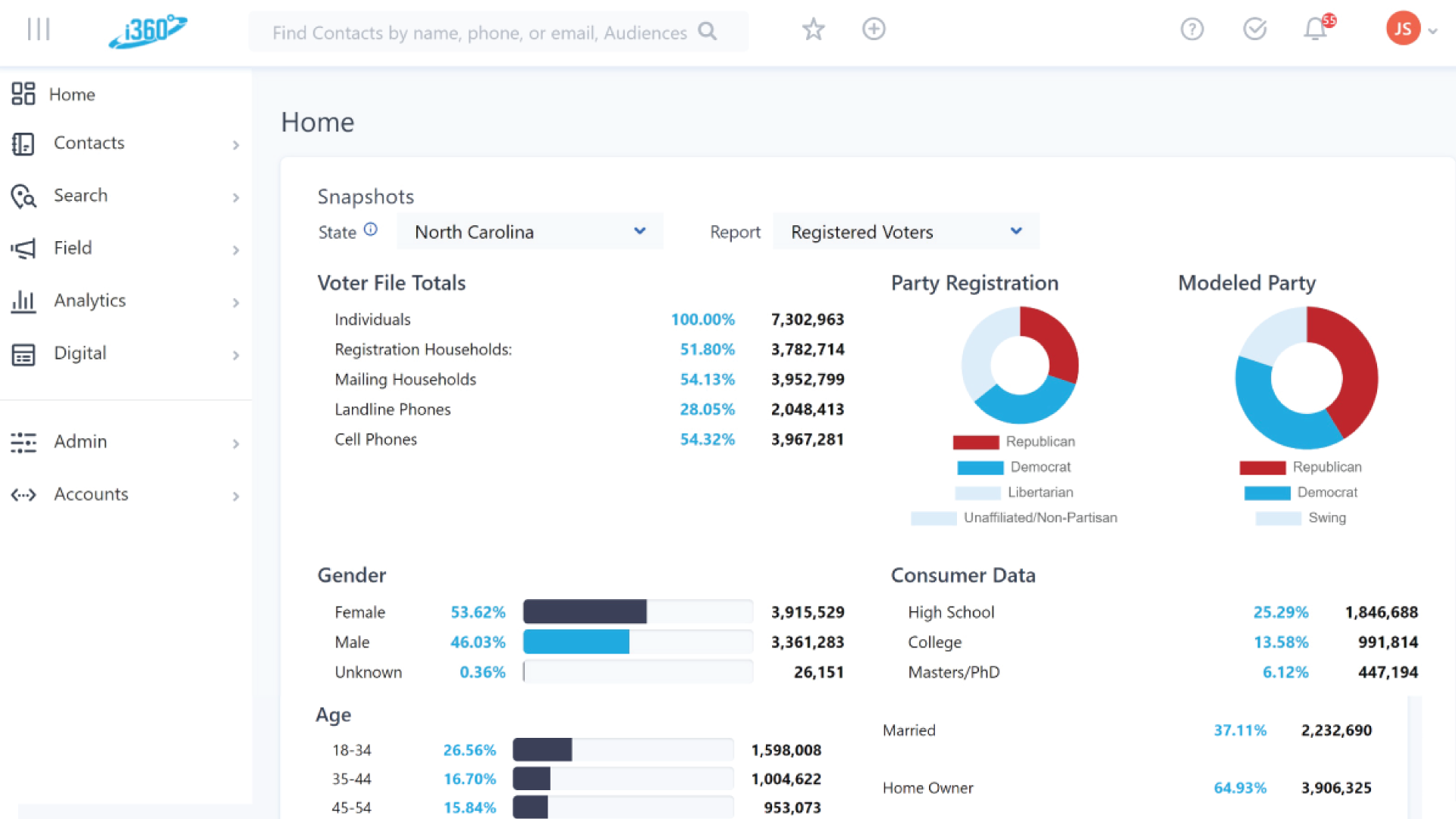 Designed for ease of use and efficiency, the i360 Portal is the key to unlocking your data, understanding your audiences, and building deeper relationships with your contacts. Easily create custom audiences using hundreds of variables, import & export data, manage your contacts, create surveys, and visualize your results.